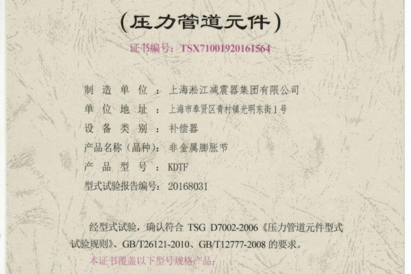 上海淞江集团旗下网站为您介绍:《可曲挠橡胶补偿接头》特种设备型式试验证书,信息真实可靠,盗版违用必究。淞江集团2016年8月26日荣获国家特种设备型式试验证书,淞江牌可曲挠橡胶补偿接头经过了国家严格的各项检测。